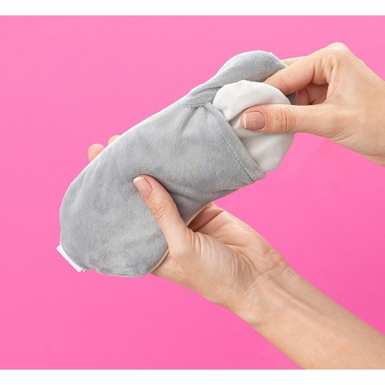 Once warm, the bag is re-inserted into the mask, placed on closed eyes and left to work for a few minutes,.